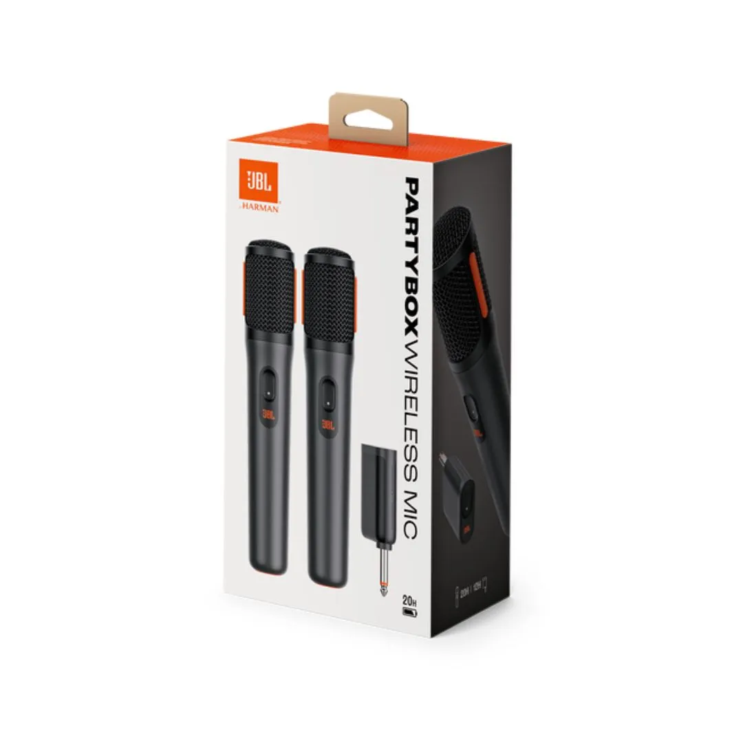Haz que tus buenos momentos sean aún mejores con los micrófonos inalámbricos JBL PartyBox. Simplemente conéctalos a cualquier JBL PartyBox o utiliza el dongle para disfrutar de la libertad de una conexión inalámbrica y deja que tu voz se escuche. Conseguirás un sonido claro y fascinante tanto en espacios interiores como exteriores con estos micrófonos especialmente diseñados para reproducir un sonido increíble en cualquier altavoz PartyBox. El filtro pop de espuma incorporado minimiza los sonidos de voz externos mientras cantas un dúo con tu mejor amigo, y su sistema de montura a prueba de golpes evita ruidos indeseados cuando pasas el micrófono a otra persona. Hasta 20 horas de tiempo de reproducción y además, como incluso puedes usar el micrófono mientras se carga en el cargador integrado de PartyBox, la diversión continúa hasta que se termine la fiesta. Lleva el ritmo a tu casa con el micrófono inalámbrico JBL PartyBox.
